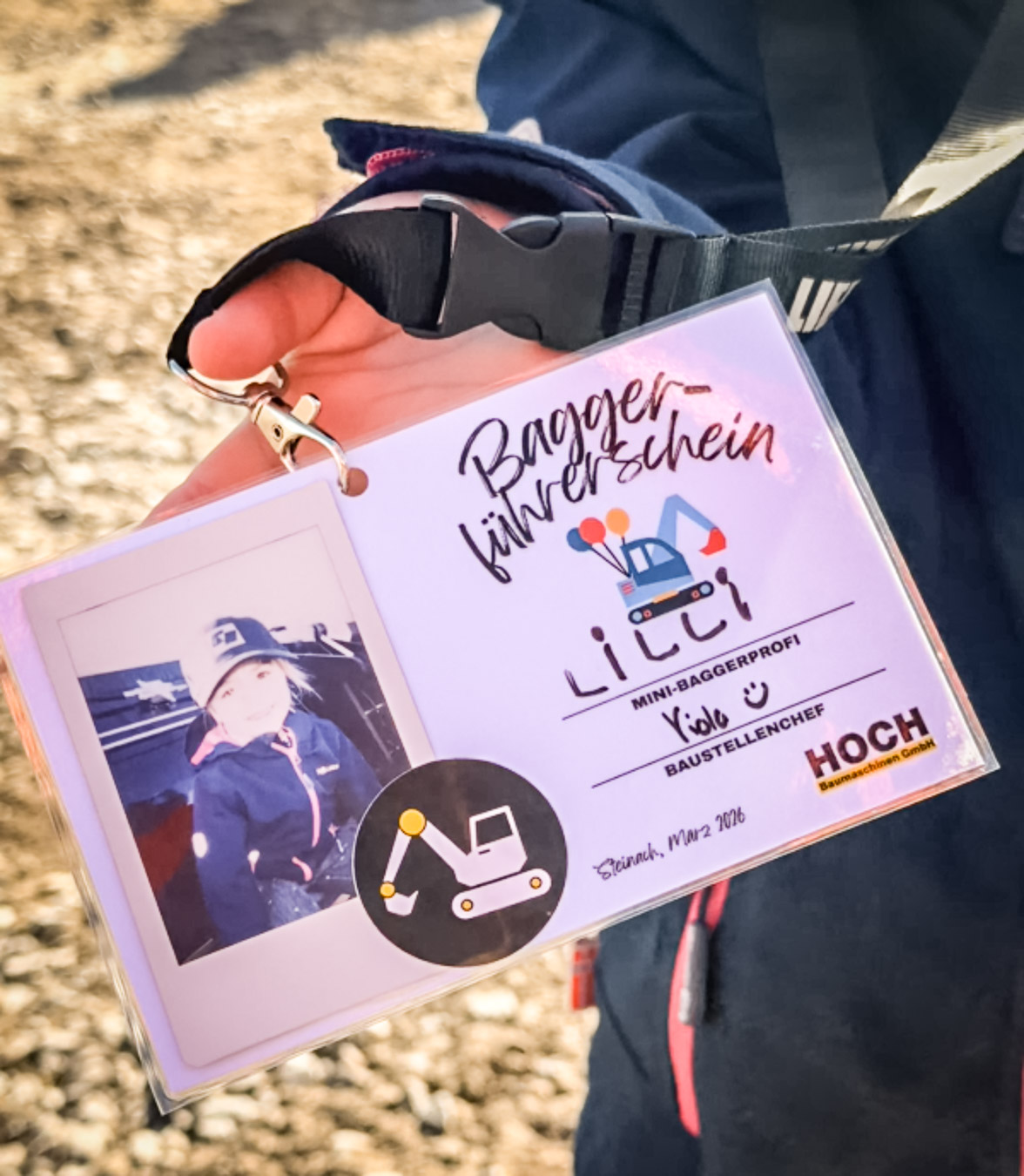 Zum Abschluss wartete noch eine ganz besondere Überraschung: der offizielle HOCH-Baggerführerschein. Nachdem jedes Kind einmal auf dem Bagger gesessen hatte, bekam es seinen eigenen kleinen Führerschein – inklusive Polaroid-Foto direkt vom Bagger. Die stolzen Gesichter der frisch gebackenen „Mini-Baggerprofis“ sprachen für sich.