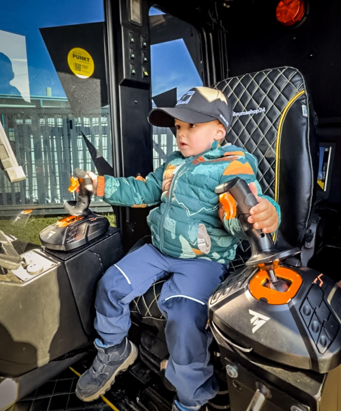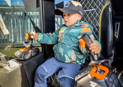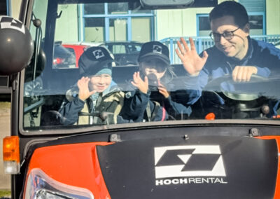 Und so verwandelte sich unser Hof für einen Vormittag in eine kleine Baustellen-Erlebniswelt. Am Bagger-Simulator konnten die Kinder über einen Bildschirm Gruben ausheben, als säßen sie in einem echten Bagger. Mit viel Konzentration wurden die Joysticks bewegt und die virtuelle Schaufel gesteuert. Auch auf einem echten Minibagger konnten die kleinen Profis Platz nehmen und selbst erleben, wie sich eine Baumaschine steuern lässt. Vorsichtig wurden die Hebel bewegt – und schnell war klar: Baggerfahren macht richtig Spaß. Zwischendurch kickten die Kinder Fußbälle in Baggerschaufeln. Was zunächst einfach klang, entpuppte sich schnell als kleine Geschicklichkeitsprüfung – begleitet von viel Jubel, Gelächter und jeder Menge Teamgeist auf dem Hof. Natürlich wollten die Kinder auch die großen Maschinen sehen. Deshalb ging es als Highlight mit einem RTV gemeinsam mit Fabio Hoch über den Hof, vorbei an unseren riesigen und beeindruckenden Baggern und Baumaschinen.